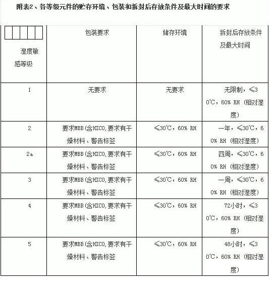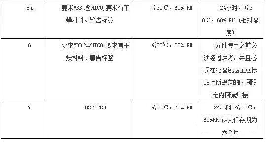 9.1 湿度敏感元件在生产使用中暴露时间的规定应根据表中不同湿度敏感等级对应的拆封后存放条件和标准来执行;如果来料警示标贴上已有规定且要求比表中的规定更为严格,则依据警示标贴上所规定的条件执行。